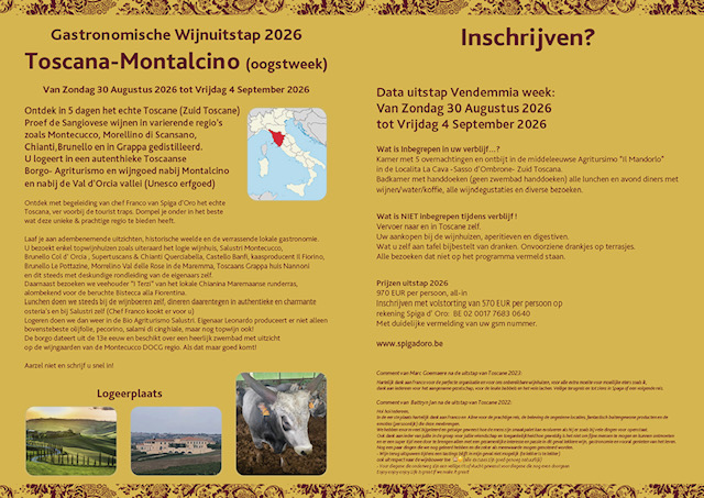 Elke lunch en diner uitraard steeds in lokale osteria’s wordt op smaak gebracht met bijhorende lokale topwijnen. Voeg daar een vleugje elegantie en luxe aan toe en je hebt het perfecte recept voor gastronomisch genot en verblijf in Toscane. Uitraard kan u alle geproefde wijnen aankopen aan zéér voordelige prijzen.