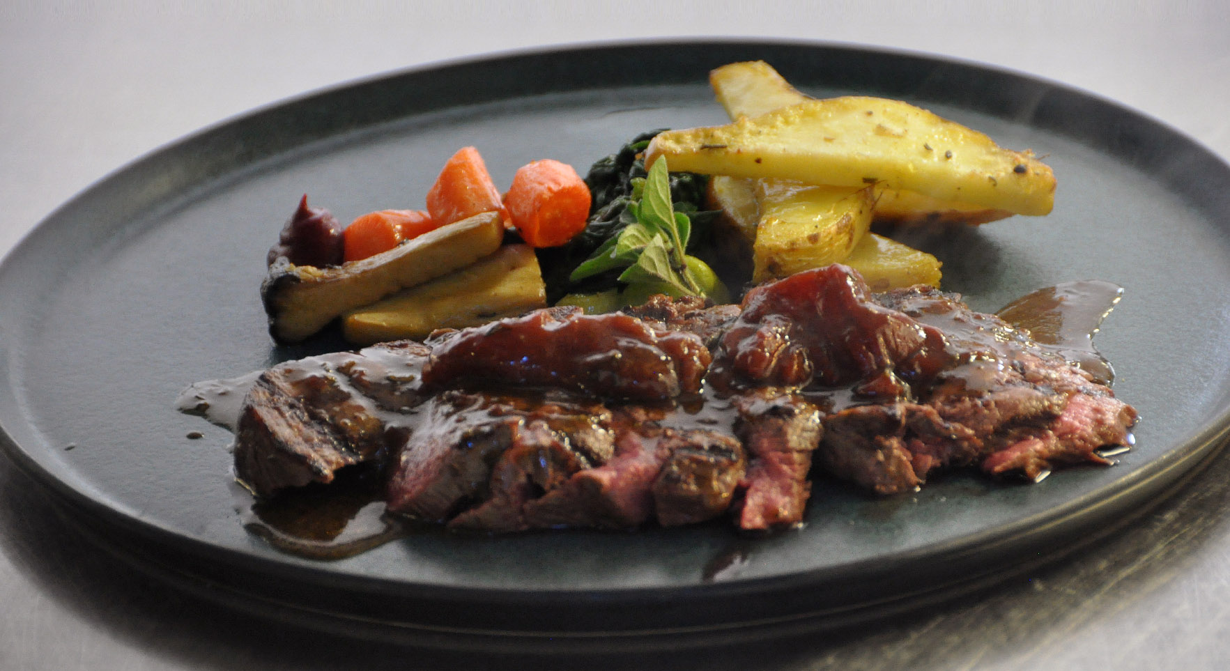 Chef Francesco gebruikt tijd (low t° & slow time ) en de delicatesse van hitte & gerookte kruiden om een Reale-snit (runds, hals & wangen) v/h Maremmaanse ras te ‘transformeren’ in een smaakbom