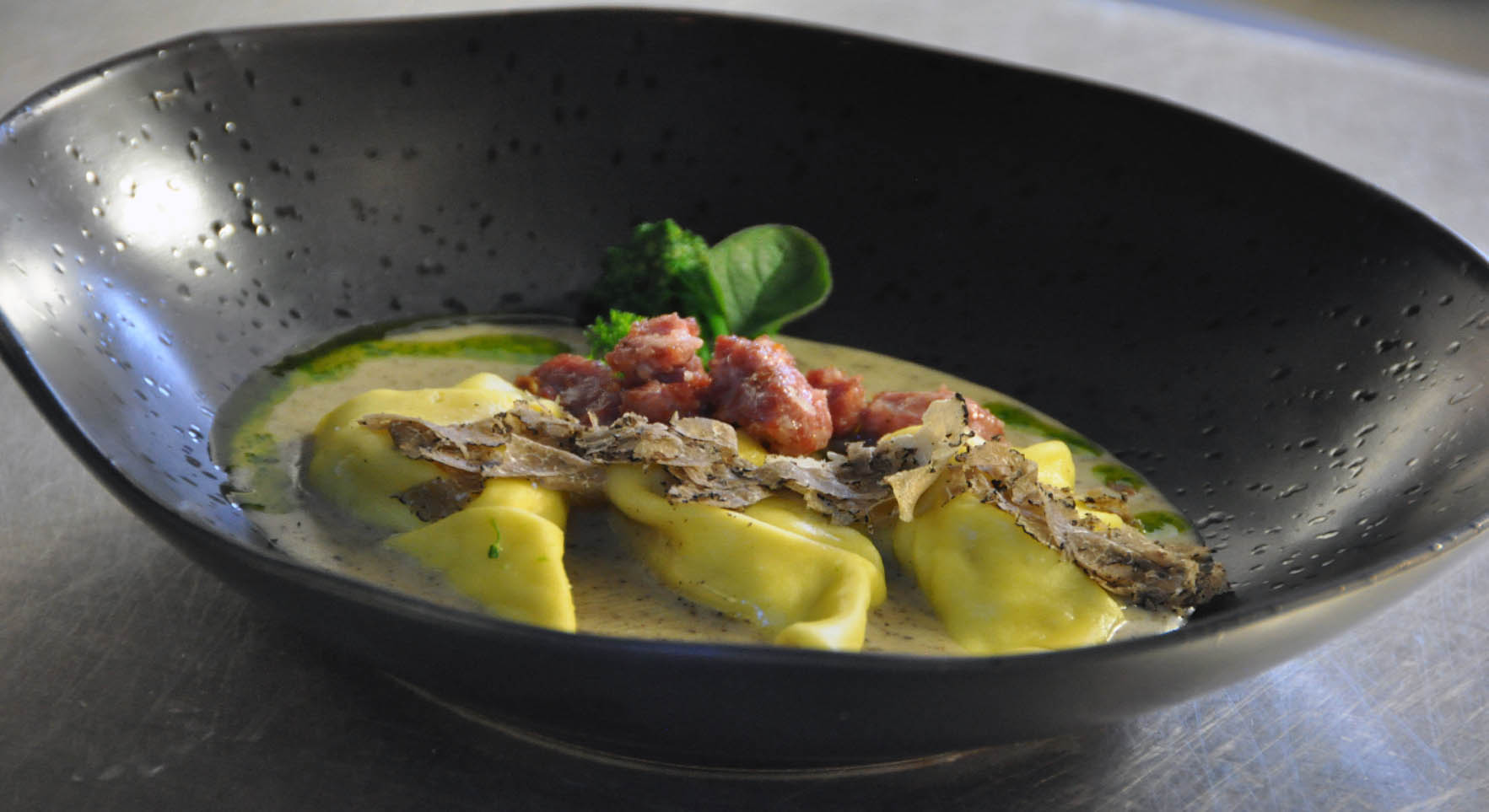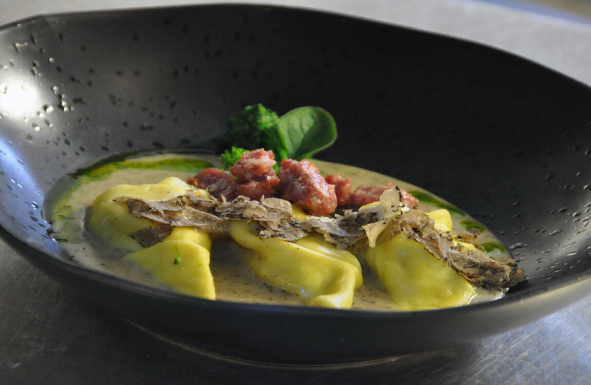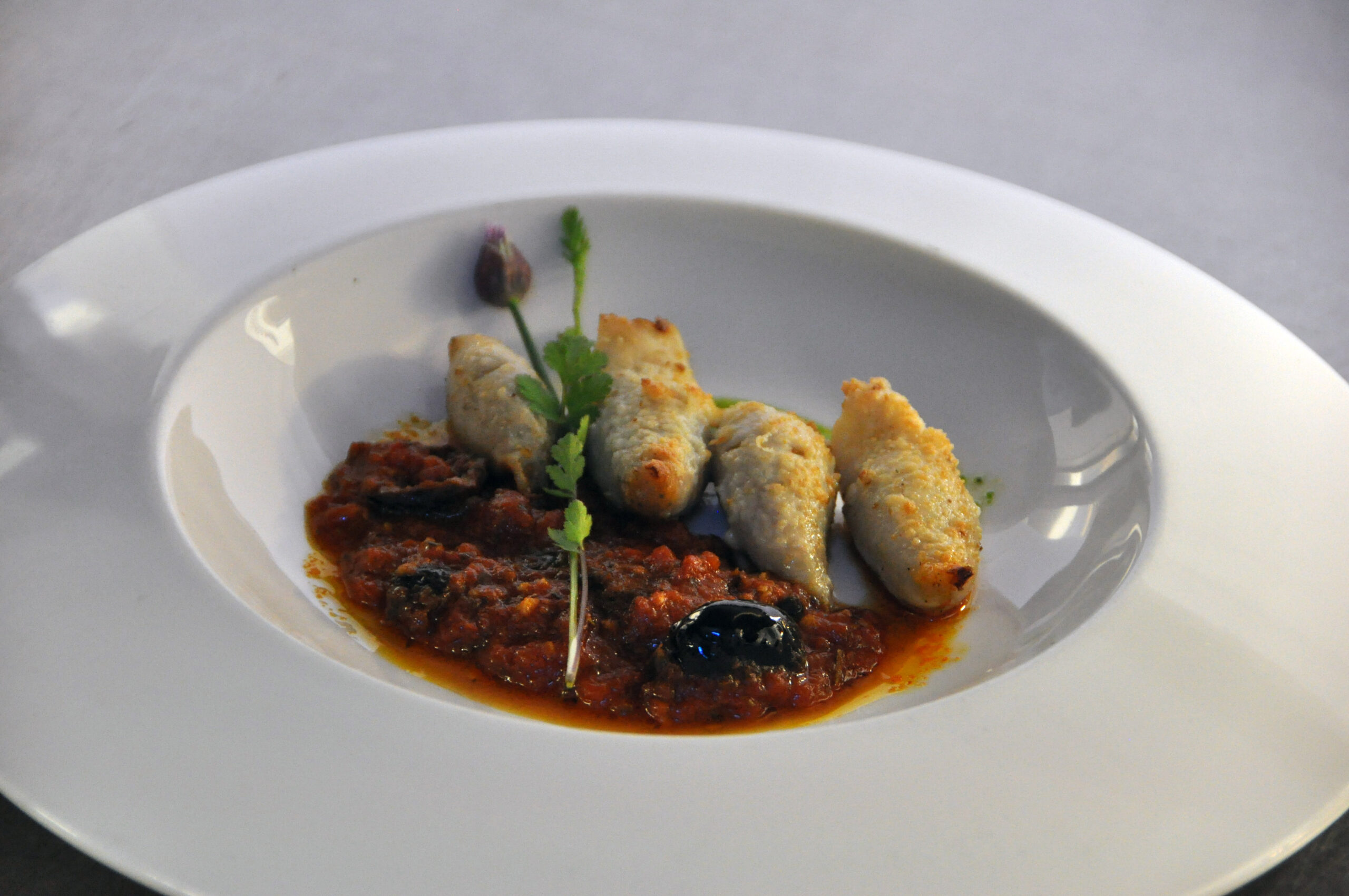 Kalfsinvoltini gevuld met ragout van verse worst uit Bra, fontinakaas uit Val d’Aosta, verse oregano, salie-en limoensaus, fritto van bocconcini met raapstelen