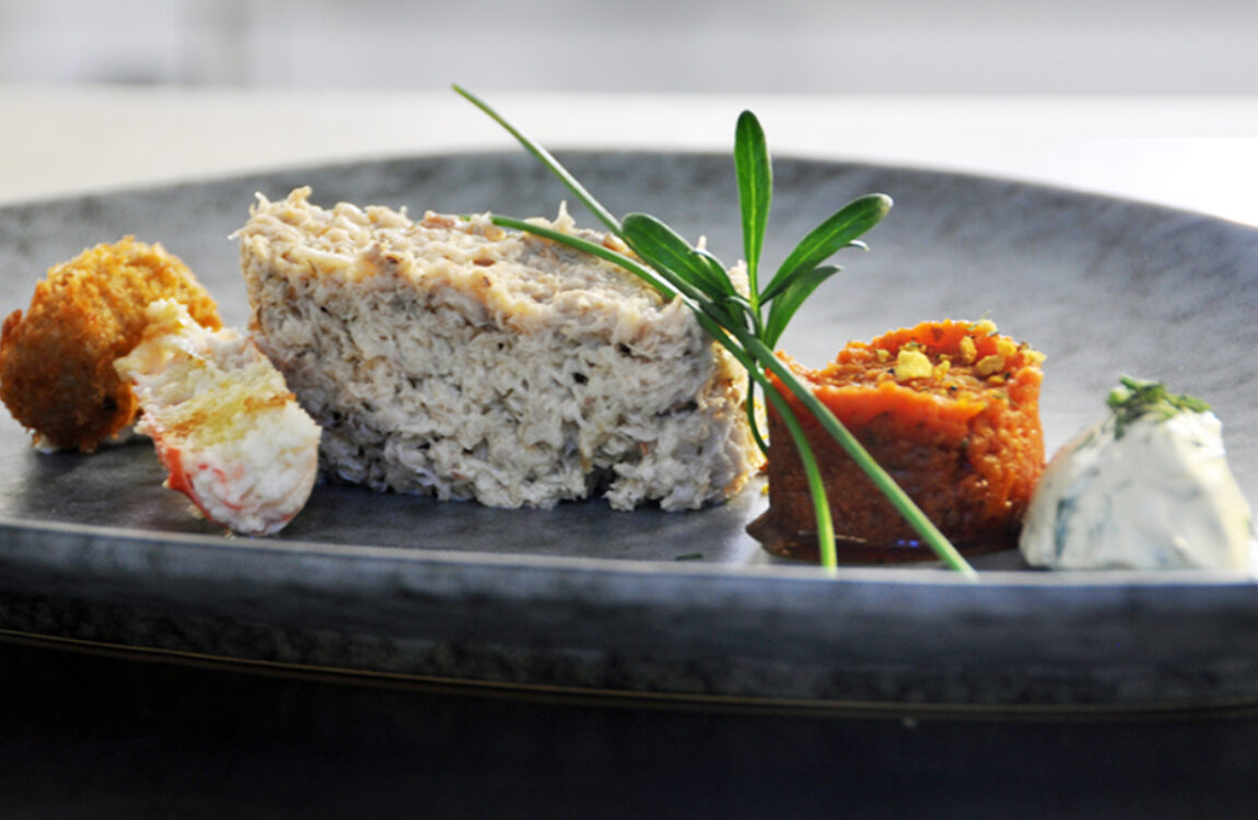 Noorse skreifilet, kruidenkorst, romige preisaus met handgepelde grijze garnalen, risotto Venere met bottarga