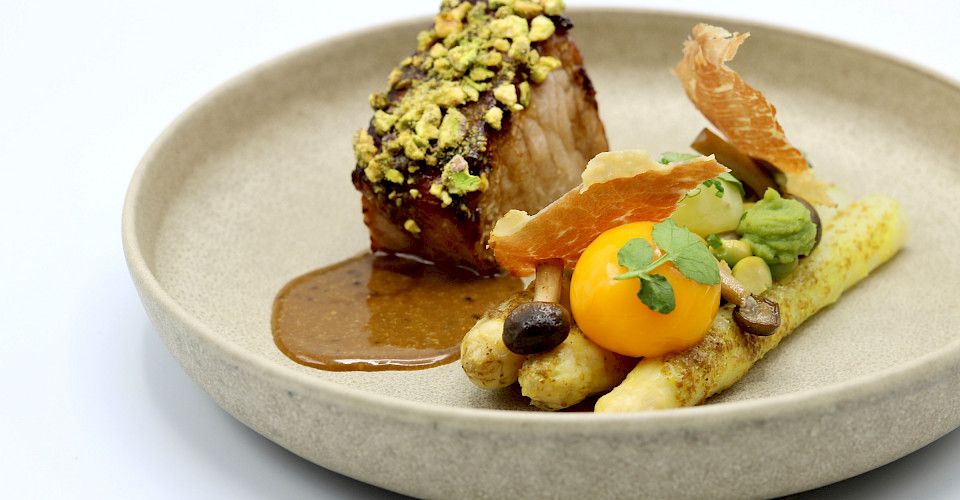 Licht gepekeld, pesto van pistashe, agrodolce saus